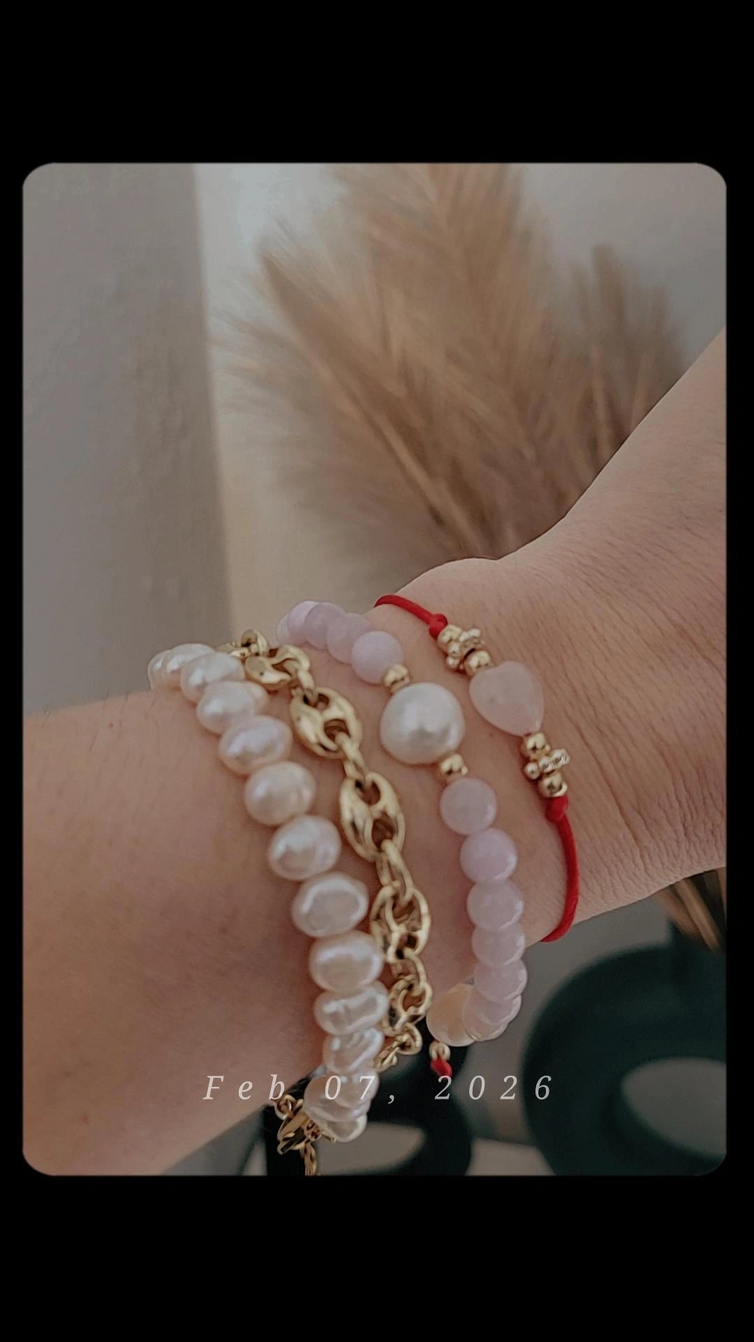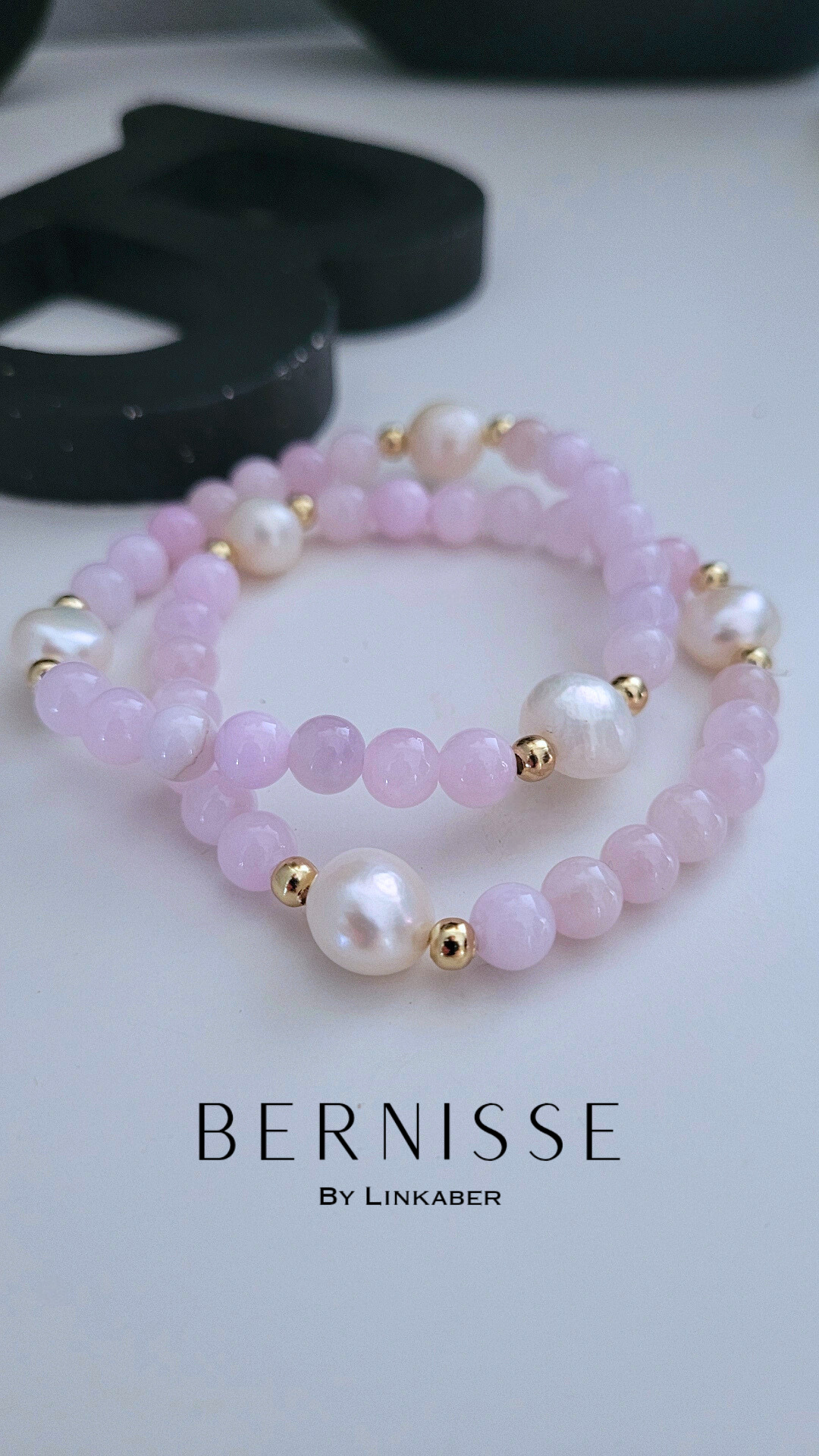 Pulsera elástica en piedras kunzita rosada, perlas de agua dulce y stainless steel